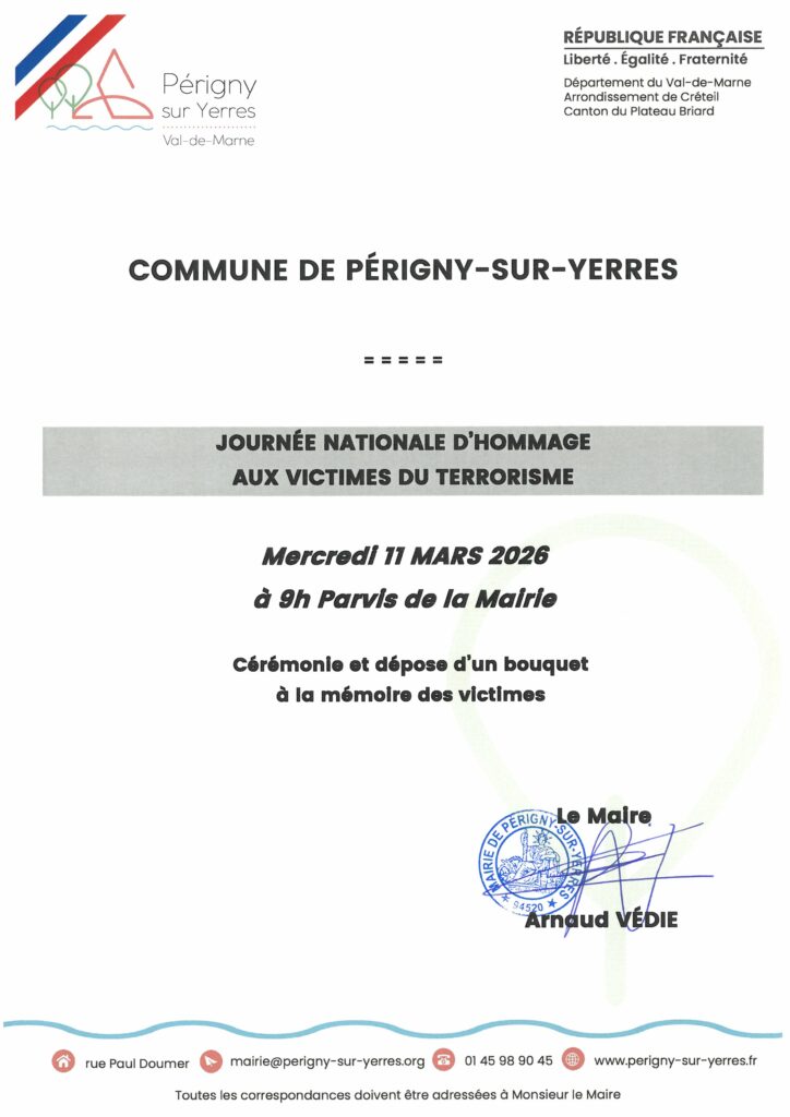 Le Maire Arnaud VEDIE et son conseil municipal rendront un hommage à la mémoire des victimes du terrorisme le Mercredi 11 Mars 2026 à 9h30 sur le parvis de la Mairie.