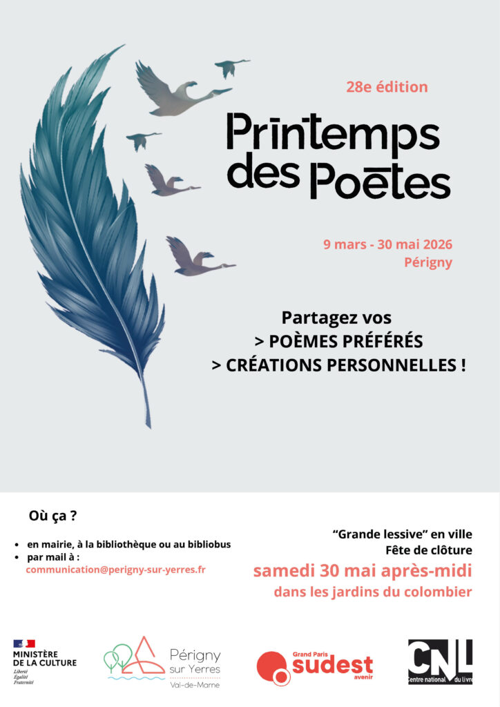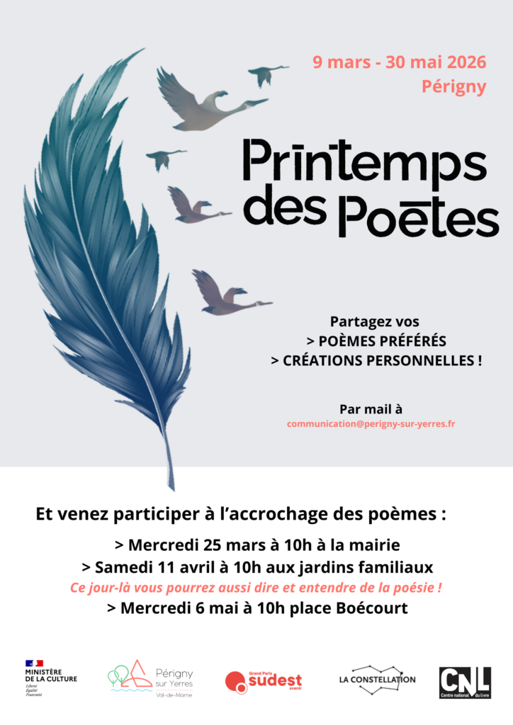 Déposez vos poèmes préférés et vos créations personnelles en mairie, à la bibliothèque La Brie Qui Lit, au Bibliobus ou bien adressez-les par mail à communication@perigny-sur-yerres.org